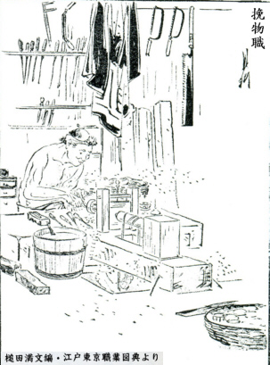 回転する装置は轆轤(ろくろ)と言いますが、轆轤は陶磁器を作成する回転台のことも表現しますから、横にした轆轤で木を切削した物は挽物と申したのでしょう。専用に研がれた刃物で横に挽くから挽物で、その刃物のことを轆轤鉋(ろくろかんな)と言っていました。
